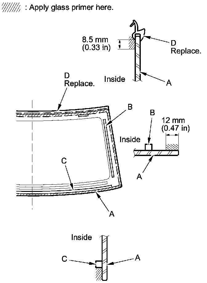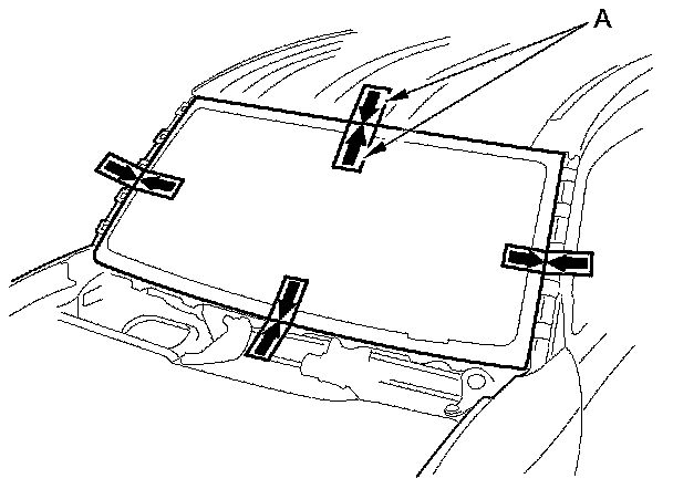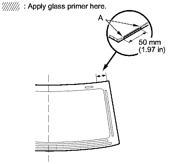 12. Apply glass primer to the edge of the windshield between the alignment marks (A). Be careful not to touch the windshield where adhesive will be applied.