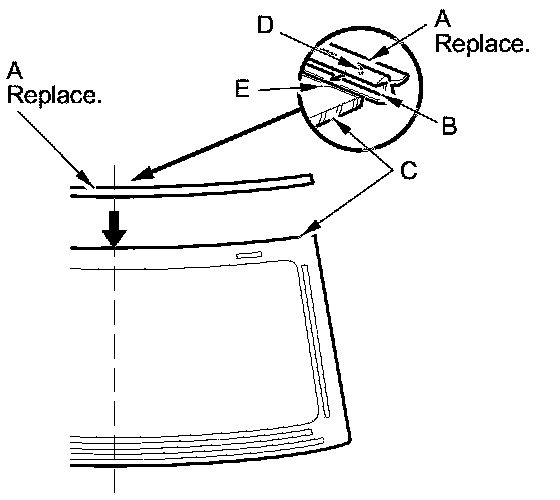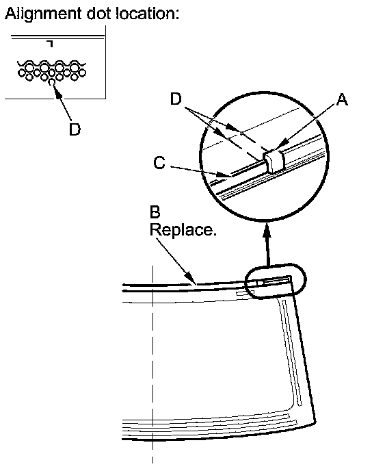 - Be sure the alignment mark (D) of the molding lines up with the alignment mark (E) of the windshield.
