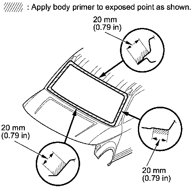 19. Carefully apply a light coat of body primer to any exposed paint around the windshield mounting flange where new adhesive is applied. Let the primer dry for at least 10 minutes: