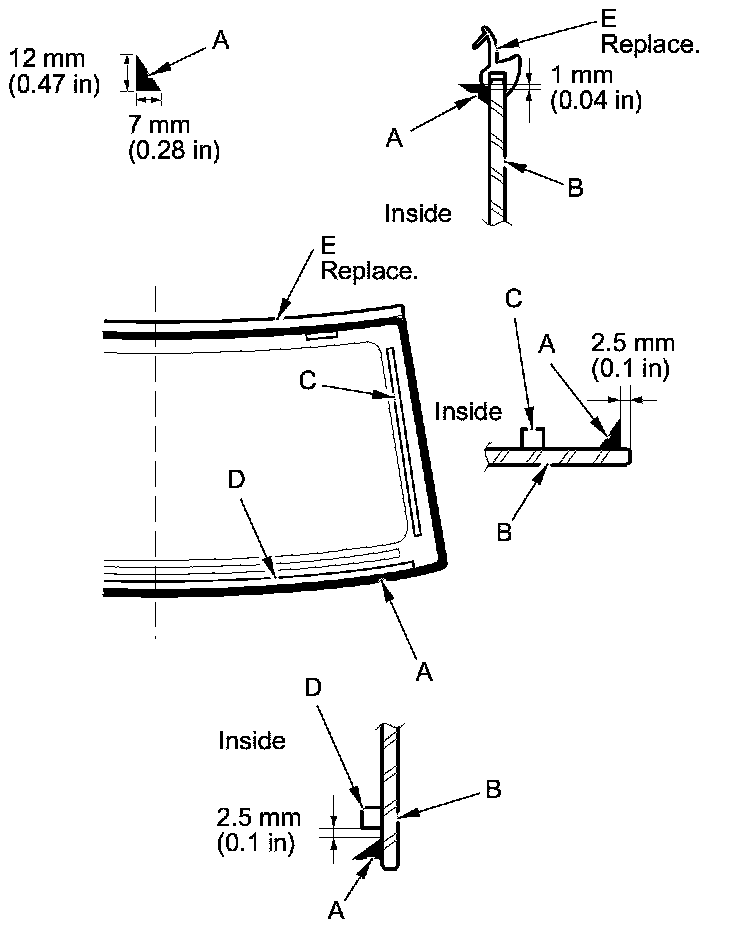 21. Put the cartridge in a caulking gun, and run a continuous bead of adhesive (A) around the edge of the windshield (B) between the side rubber dams (C), the lower rubber dam (D), and the windshield molding (E) as shown: