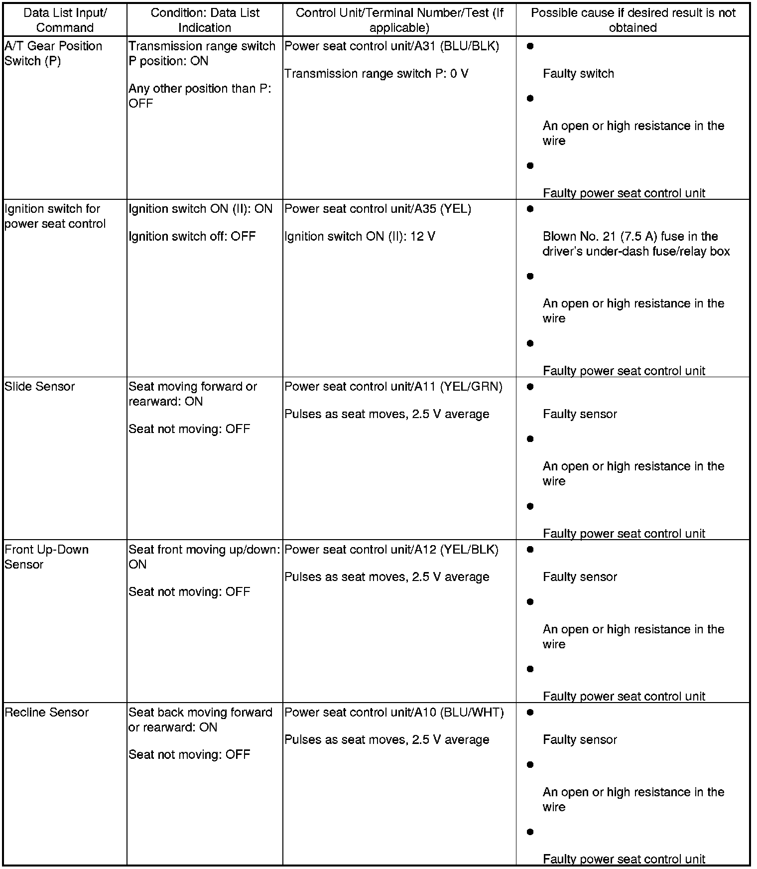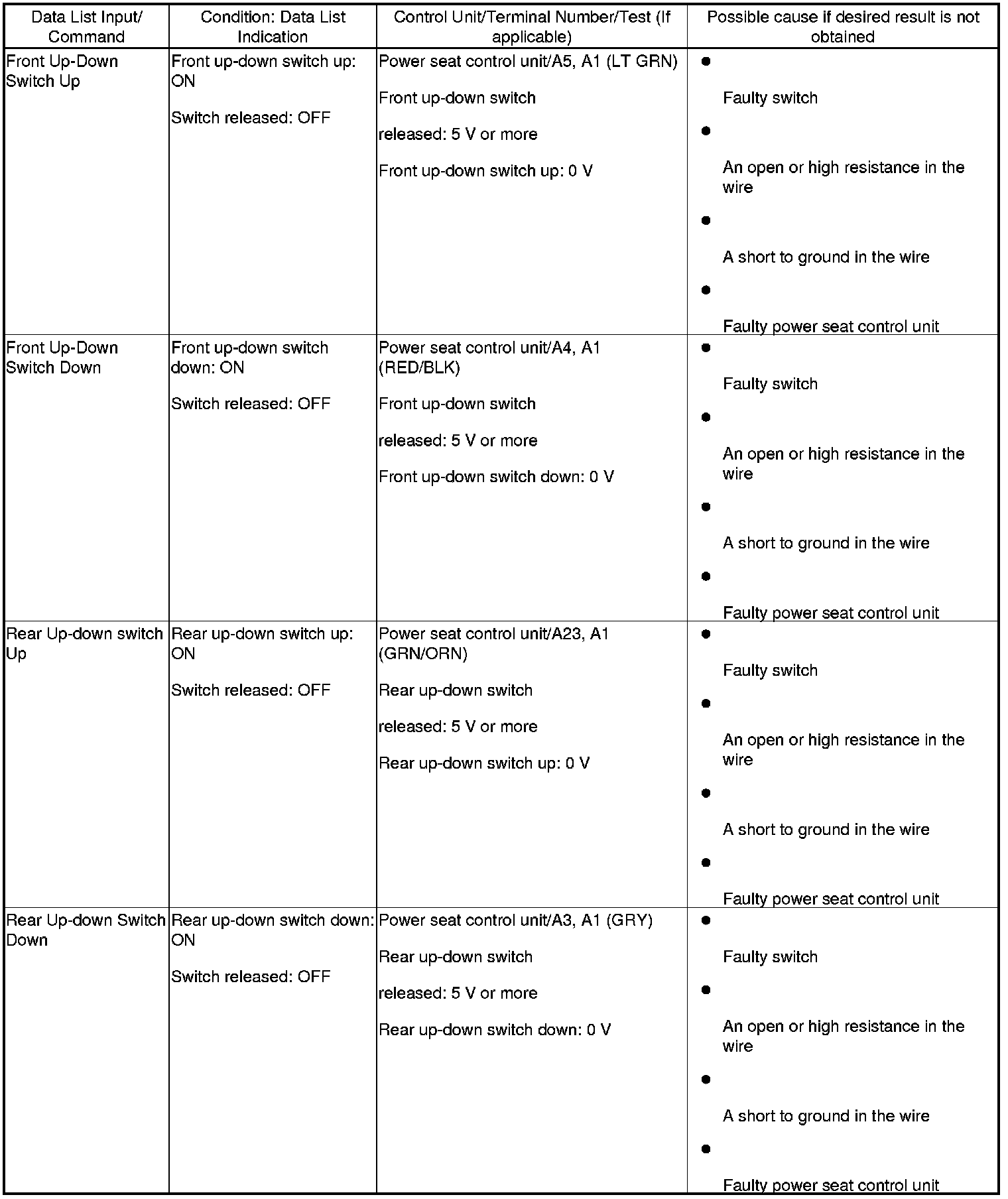 - If the data list indication is not correct, perform the appropriate test at the control unit and terminal indicated in the table.