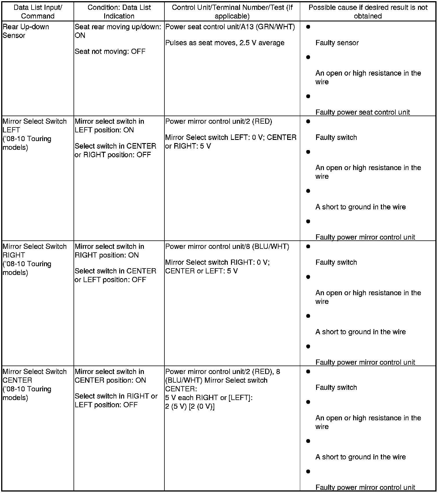 4. Exit the DTC mode and select DATA LIST from the POWER SEAT/POWER MIRROR TEST MODE menu.