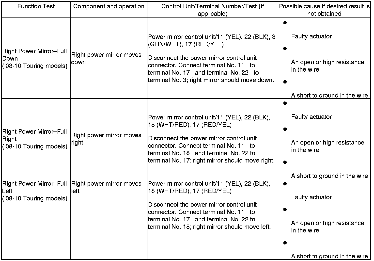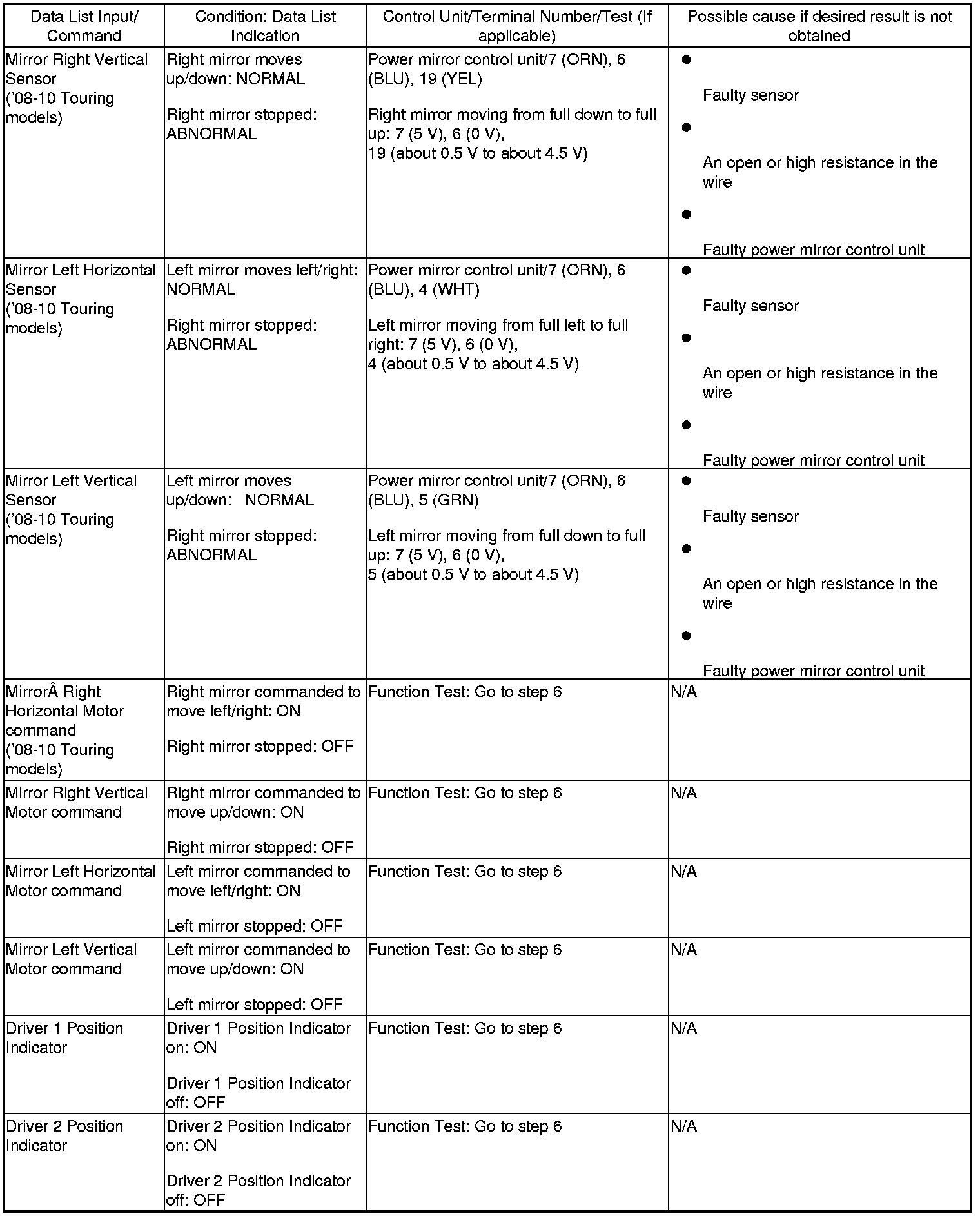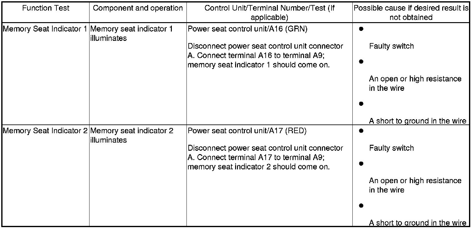 - If the function does not operate normally, perform the appropriate test at the control unit and terminal indicated in the table.