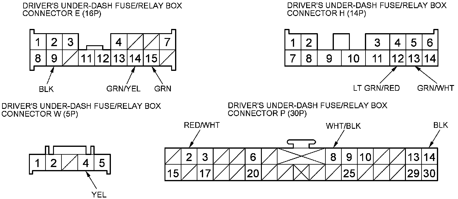 6. Reconnect the connectors to the driver's under-dash fuse/relay box. Turn the ignition switch to ON (II), and do these input tests at the following connectors on the driver's under-dash fuse/relay box.
