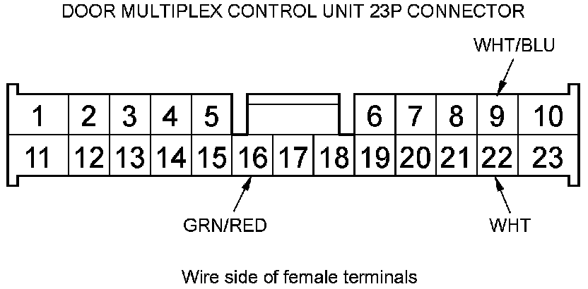 11. Reconnect the connector to the door multiplex control unit. Turn the ignition switch to ON (II), and do these input tests at the connector.