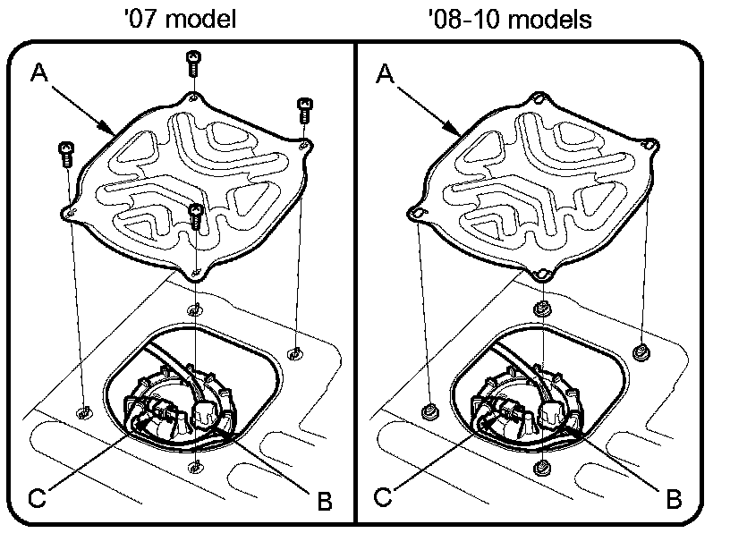 1. Temporarily attach a new base gasket (A) to the fuel tank unit (B), then insert the fuel tank unit partially into the fuel tank.