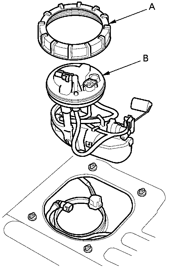 8. Remove the locknut (A) and the fuel tank unit (B).