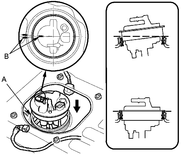 3. Align the marks (B) on the tank and the fuel tank unit, then insert the fuel tank unit into the fuel tank until the fuel tank unit rests on the base gasket.