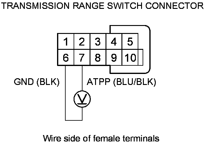 25. Measure the voltage between transmission range switch connector terminals No. 6 and No. 7.