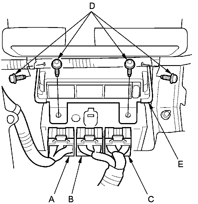 6. Disconnect the SRS unit connectors A (28P), B (28P), and C (16P). Remove the TORX bolts (D) using a TORX T30 bit, then pull out the SRS unit (E).