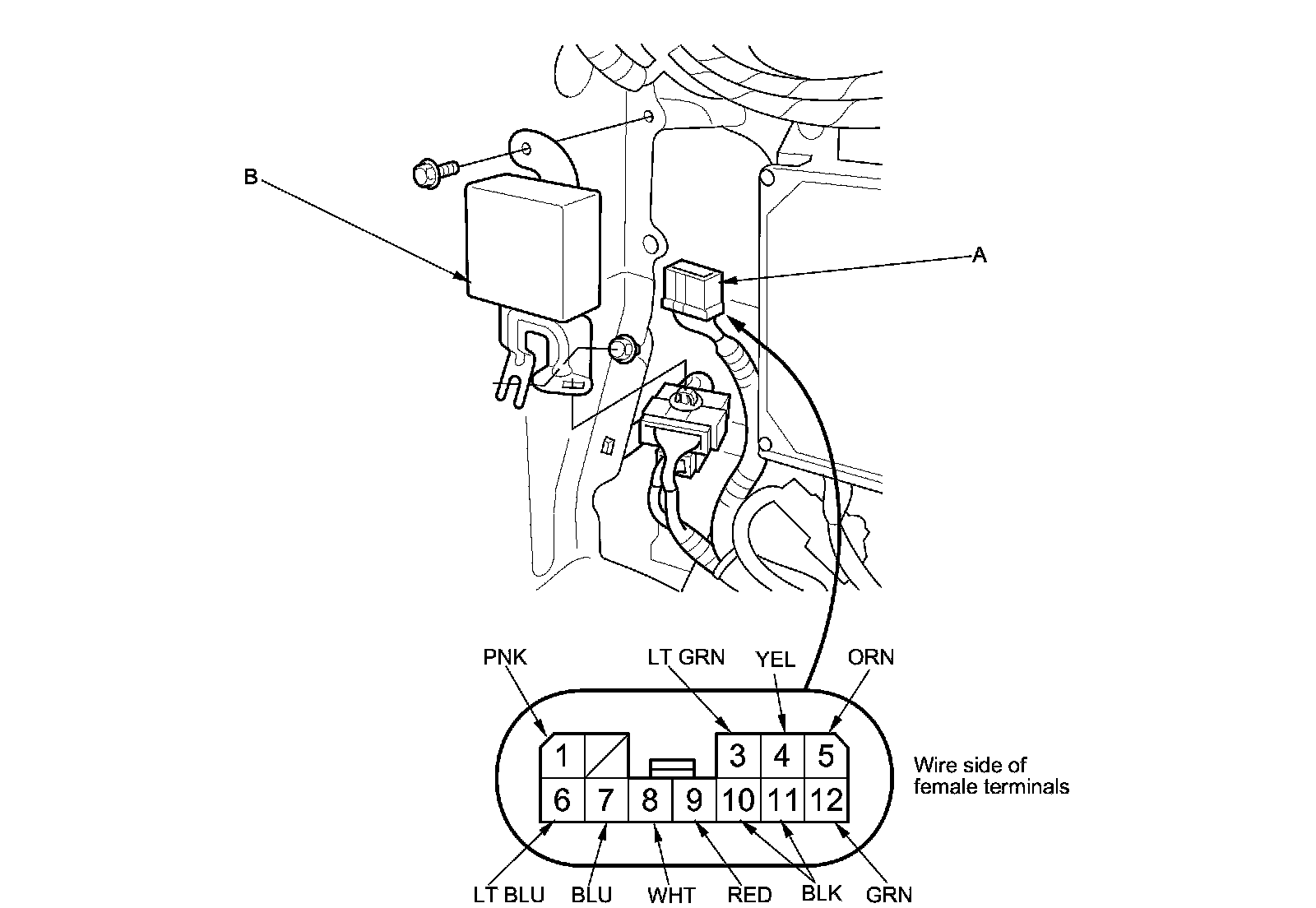 3. Disconnect the 12P connector (A) from the trailer lighting control unit (B).