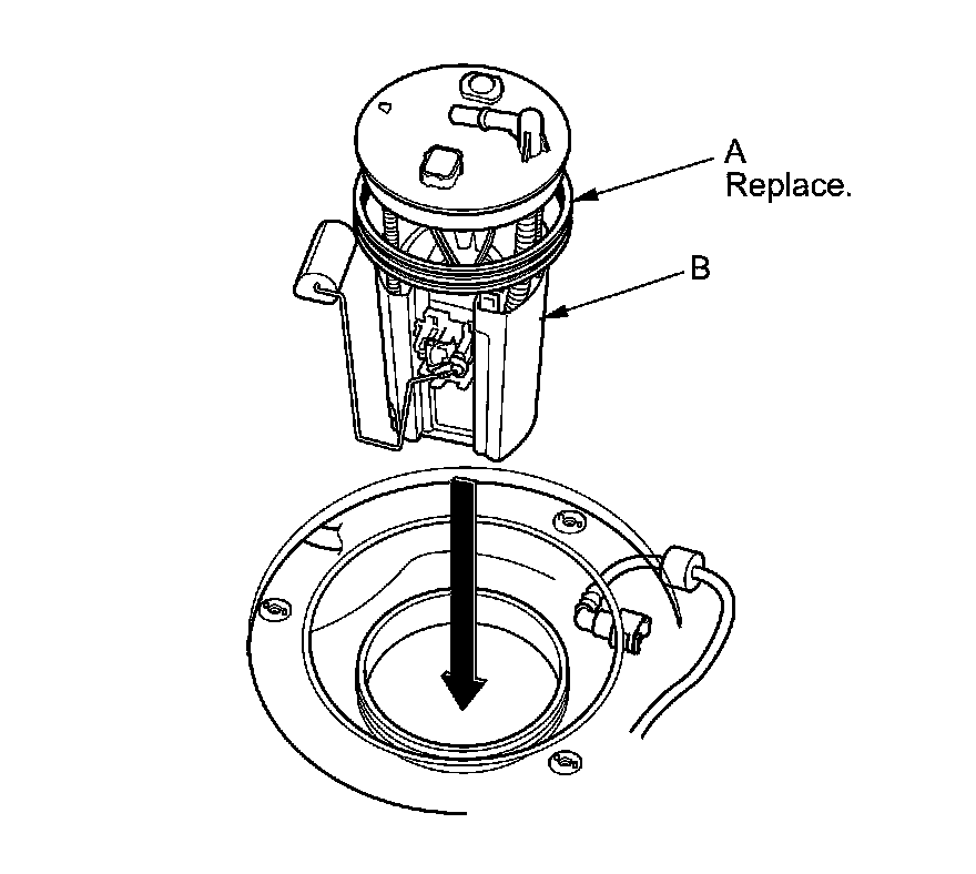 1. Temporarily attach a new base gasket (A) to the fuel tank unit (B), then insert the fuel tank unit partially into the fuel tank.