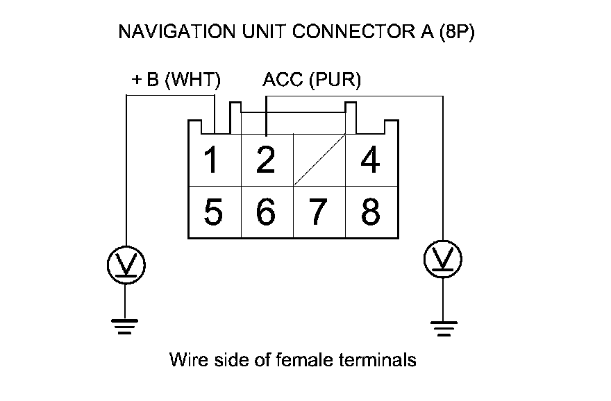 2. Measure the voltage between body ground and navigation unit connector A (8P) terminals No. 1 and No. 2 individually.