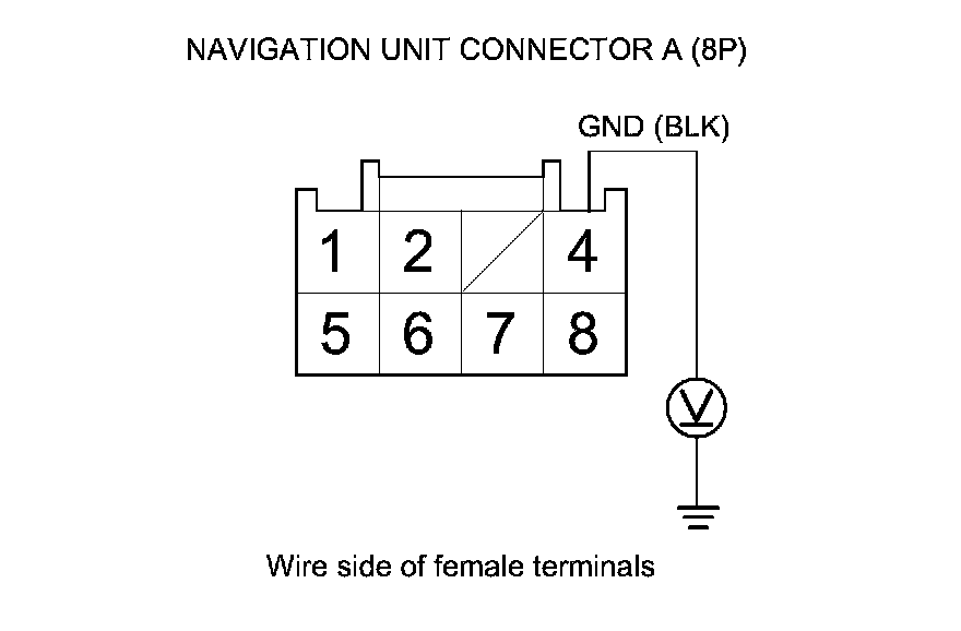3. Measure the voltage between navigation unit connector A (8P) terminal No. 4 and body ground.
