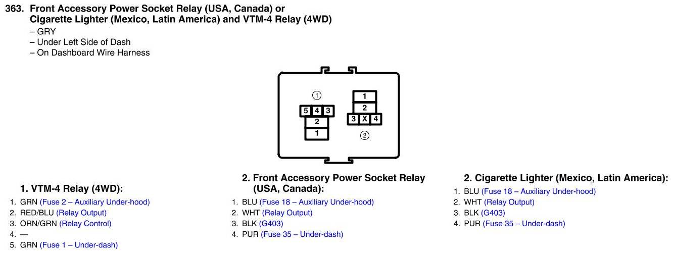 View 363 - Front Accessory Power Socket Relay, Cigarette Lighter and VTM-4 Relay Connector View