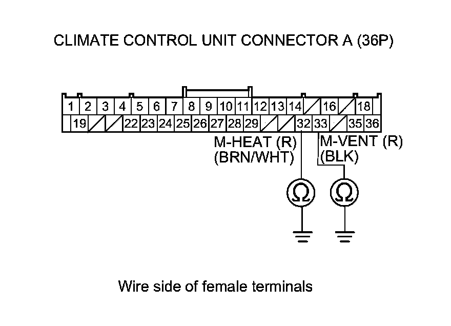 8. Check for continuity between body ground and climate control unit connector A (36P) terminals No. 32 and No. 33 individually.