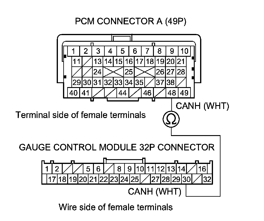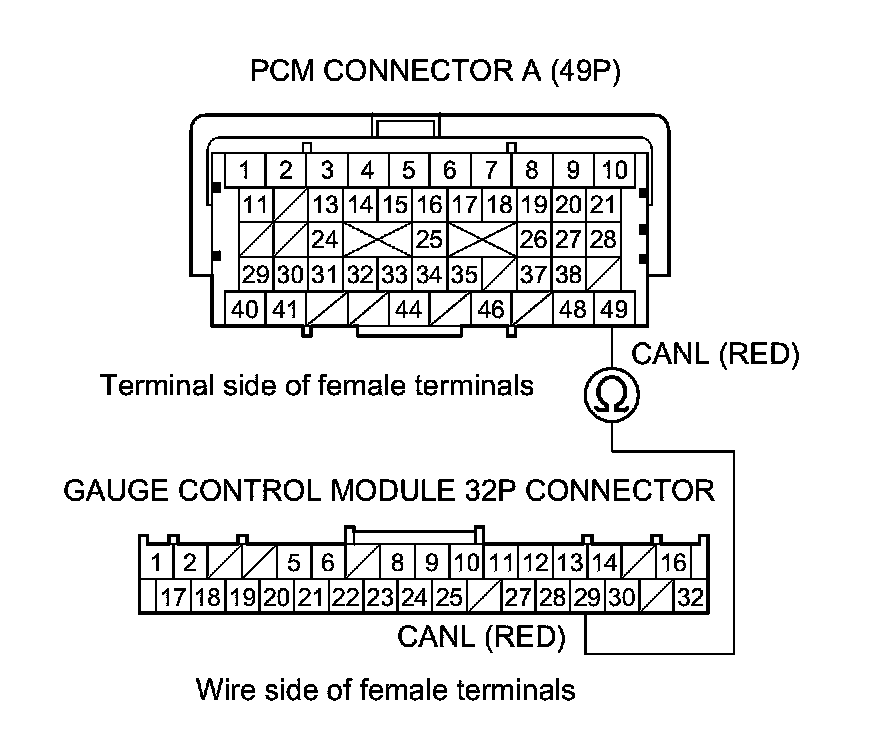 11. Check for continuity between PCM connector terminal A49 and gauge control module 32P connector terminal No. 29.