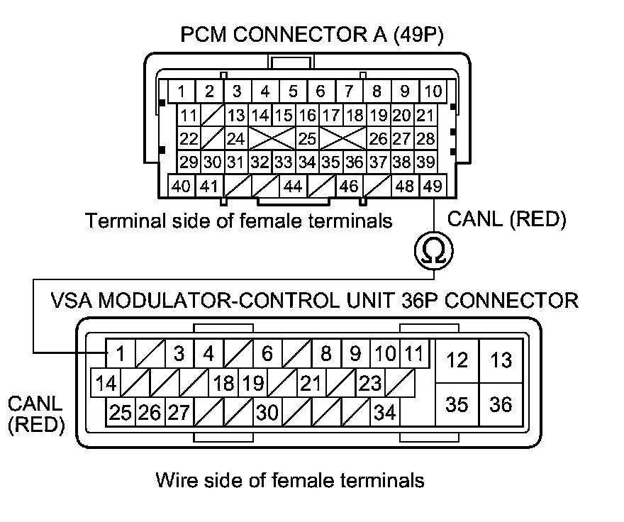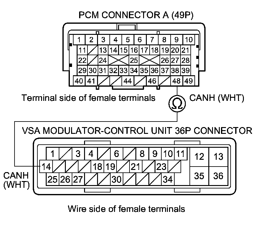 12. Check for continuity between between PCM connector terminal A49 and VSA modulator-control unit 36P connector terminal No. 1.