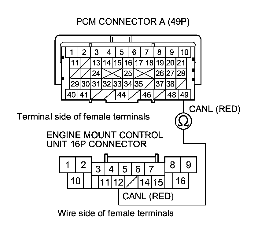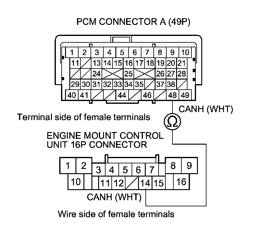 13. Check for continuity between PCM connector terminal A49 and engine mount control unit 16P connector terminal No. 12.