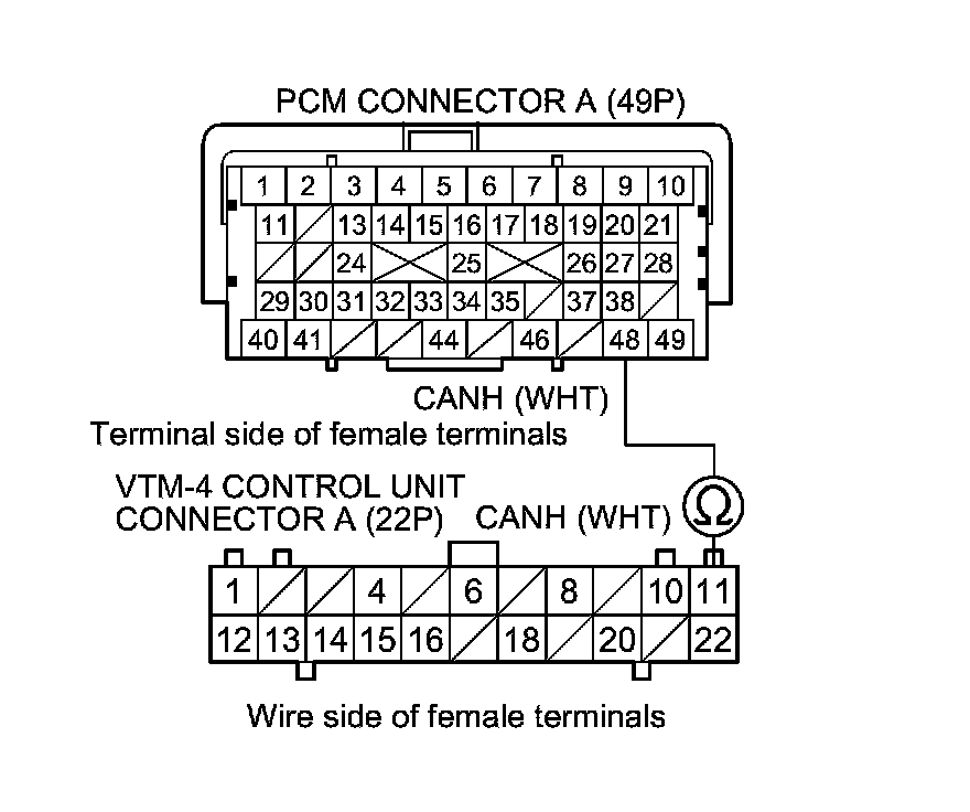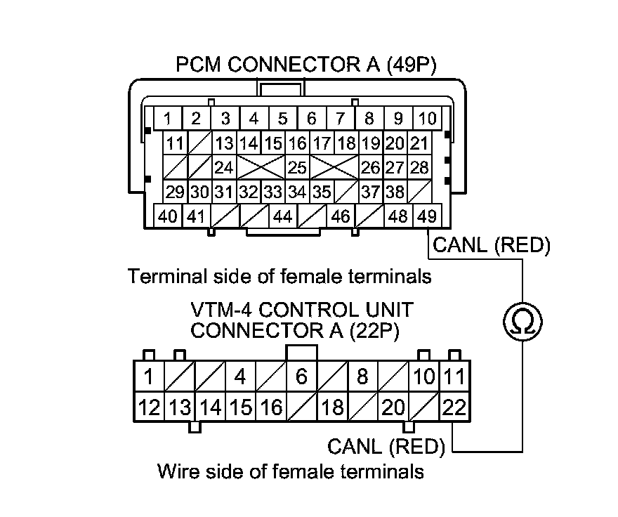 14. Check for continuity between PCM connector terminal A49 and VTM-4 control unit connector A (22P) terminal No. 22.