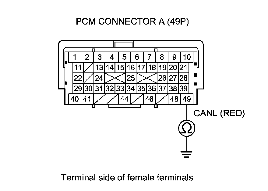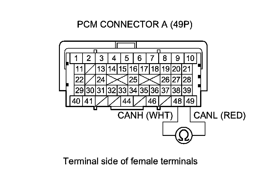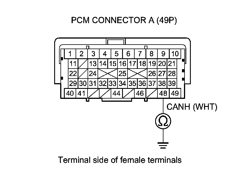 19. Measure the resistance between PCM connector terminals A48 and A49.