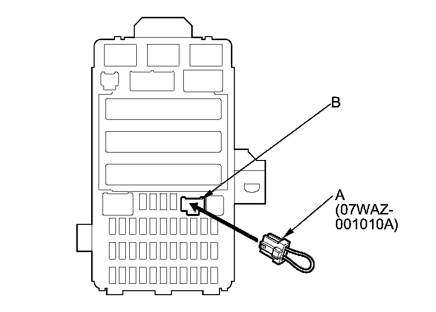 3. Connect the MPCS service connector (A) to the MICU service check connector socket (B) in the under-dash fuse/relay box.