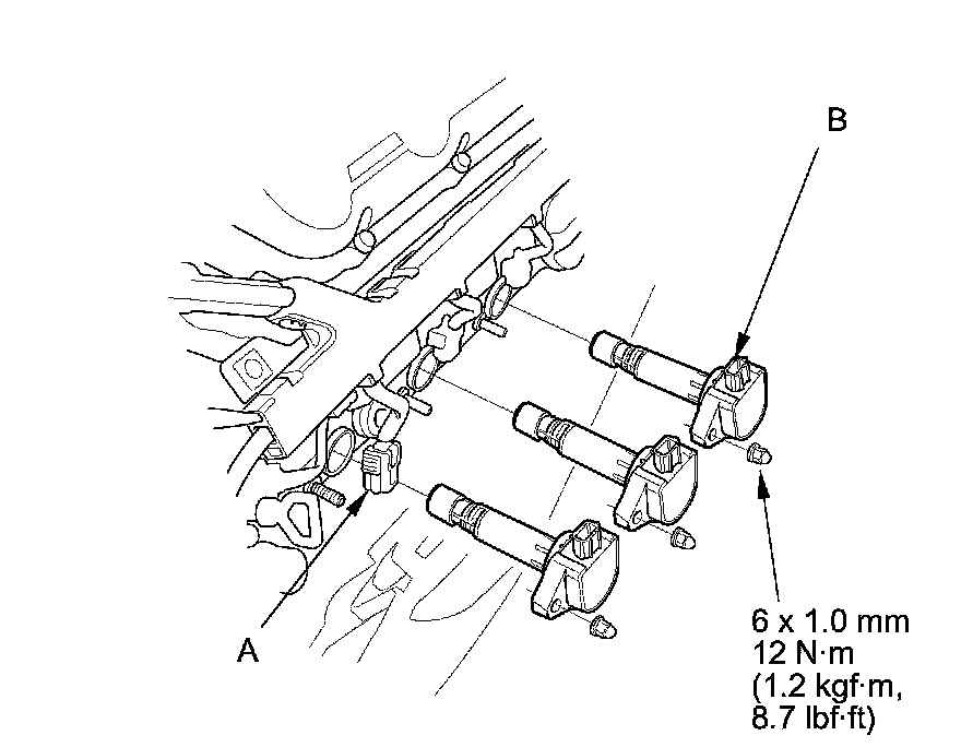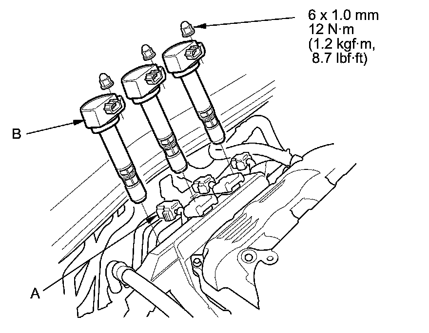 2. Disconnect the ignition coil connectors (A), then remove the ignition coils (B).
