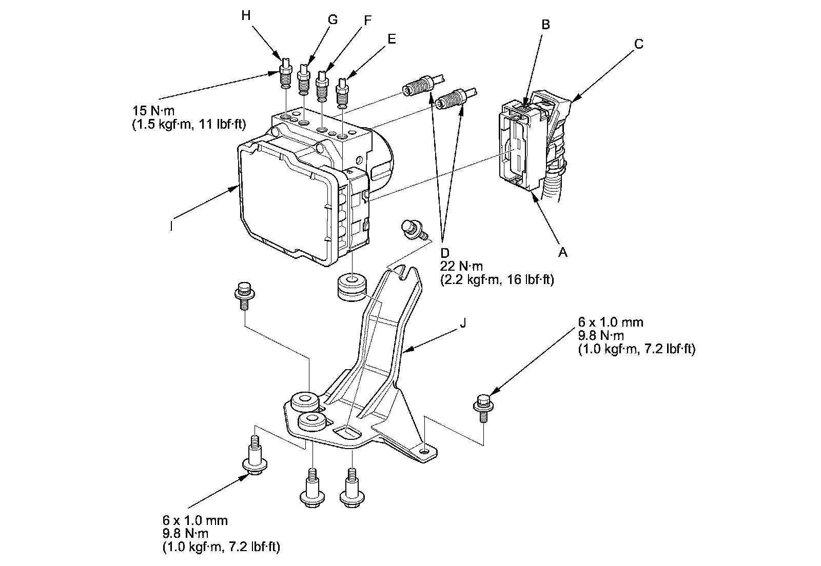 6. Remove the VSA modulator-control unit (I) with the bracket (J) from the body.