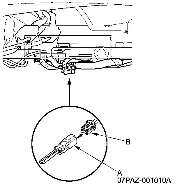 2. Connect the SCS service connector (A) to the navigation service check connector (B) located behind the navigation unit.