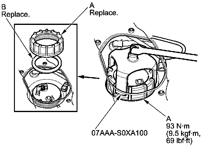 6. Using the special tool, loosen the fuel tank unit locknut (A).