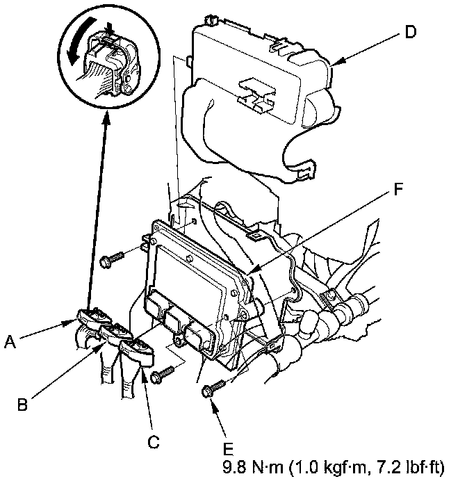 14. Remove the bolts (E), then remove the PCM assembly (F).