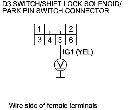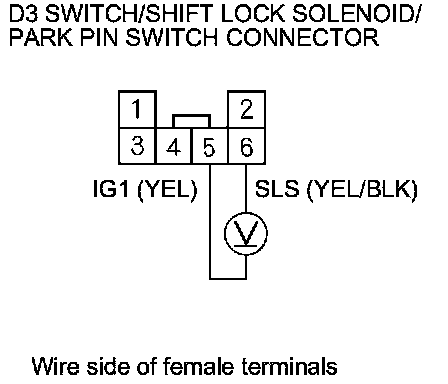 12. Release the brake pedal, and measure the voltage between D3 switch/shift lock solenoid/park pin switch connector terminals No. 5 and No. 6. The shift lever must be in P.