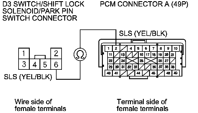 16. Check for continuity between PCM connector terminal A2 and D3 switch/shift lock solenoid/park pin switch connector terminal No. 6.
