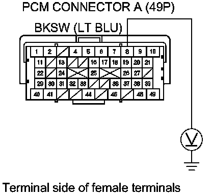 21. Measure the voltage between PCM connector terminal A8 and body ground while pressing the brake pedal and when the brake pedal is released.