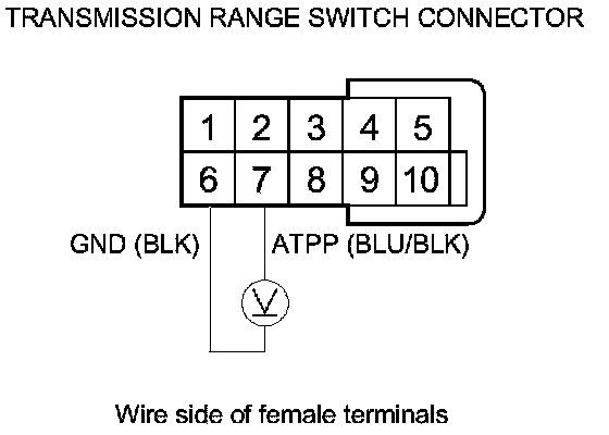 25. Measure the voltage between transmission range switch connector terminals No. 6 and No. 7.