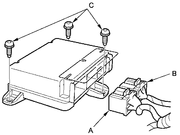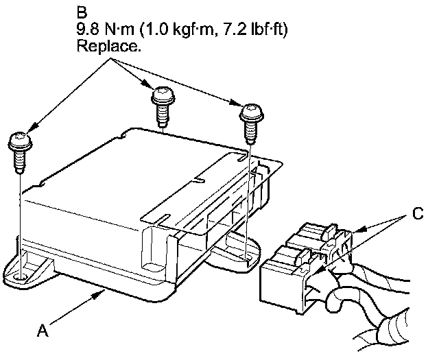 1. Install the SRS unit (A) with a new TORX bolts (B) using a TORX T30 bit, then connect the connectors (C) to the SRS unit; push them into position until they click.