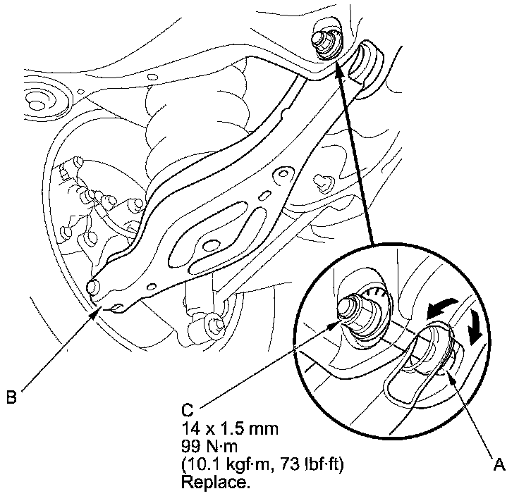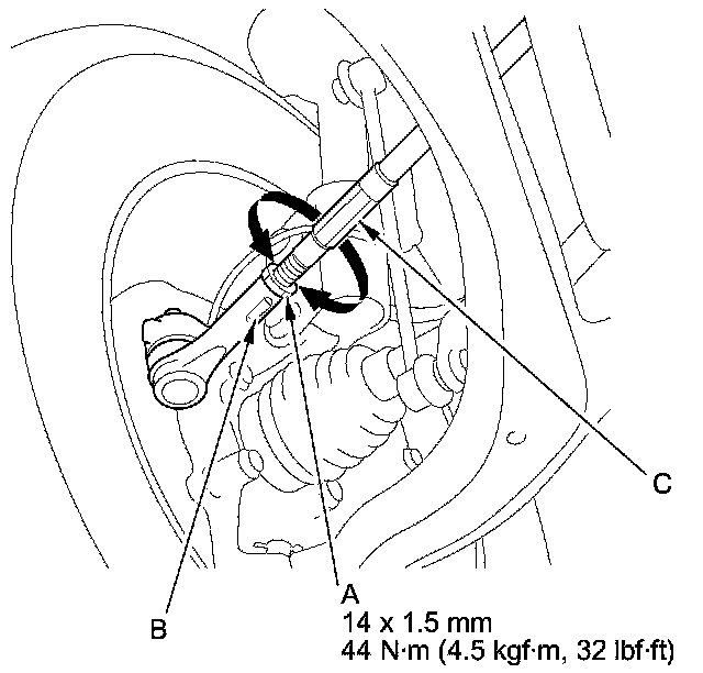 3. Hold the adjusting bolt (A) on lower arm B, and remove the self-locking nut (C).