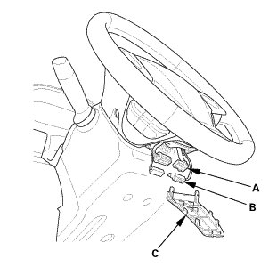 2. Disconnect the driver's airbag inflator connector (B) on the cable reel harness.