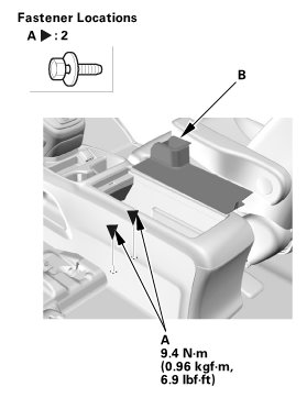 4. Remove the console box mat (A), then remove the bolts (B).