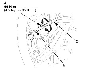1. Hold the adjusting bolt (A) on the trailing arm (B), and loosen the self-locking nut (C).