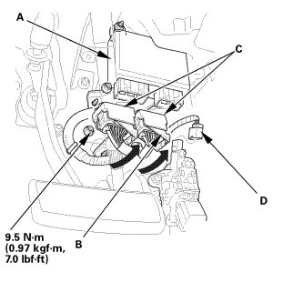 2. Disconnect the EPS control unit connectors (B) by pushing the lock (C) and pulling down the lever (D).