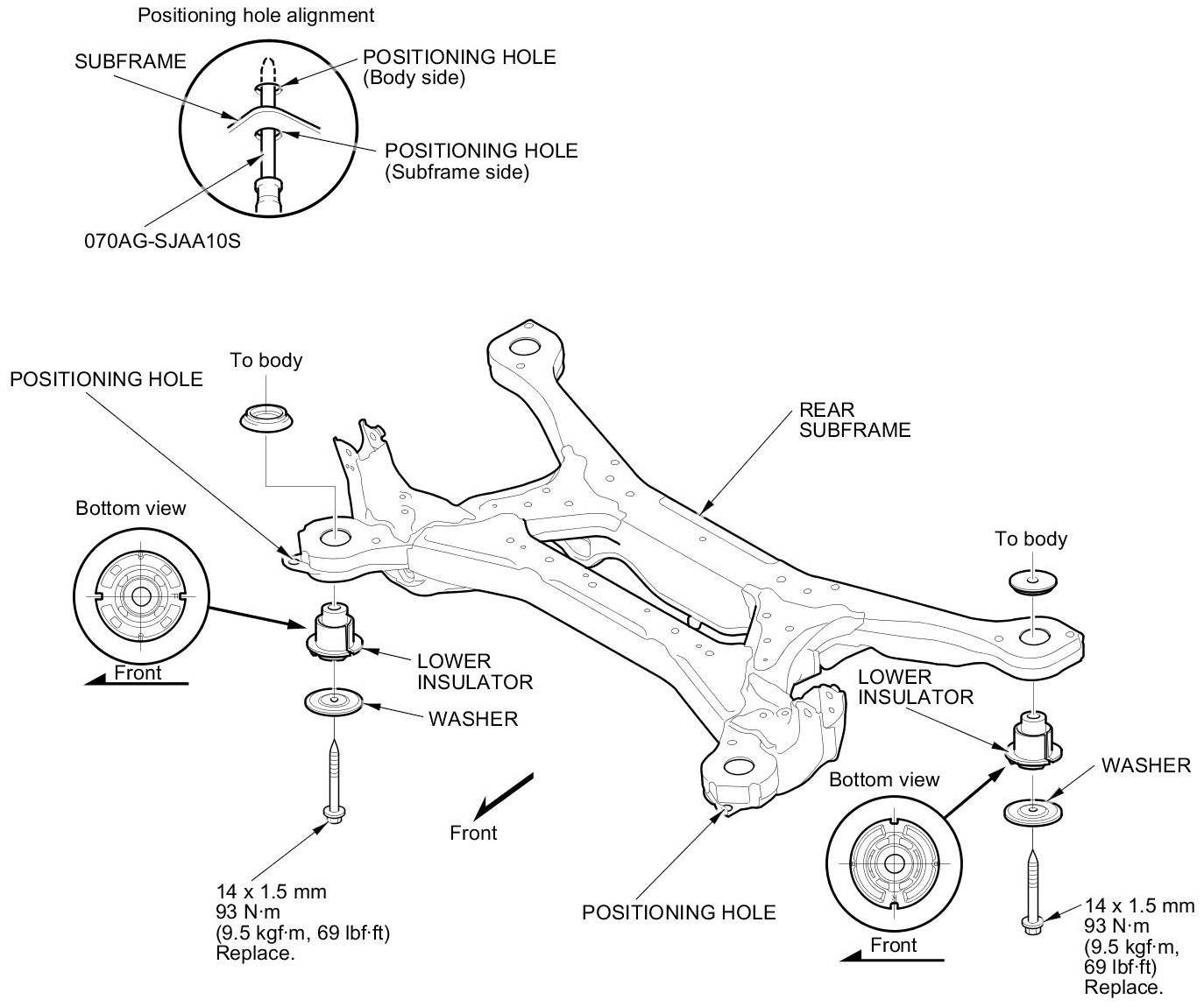 - After removing the subframe mounting bolts, be sure to replace them with new ones.