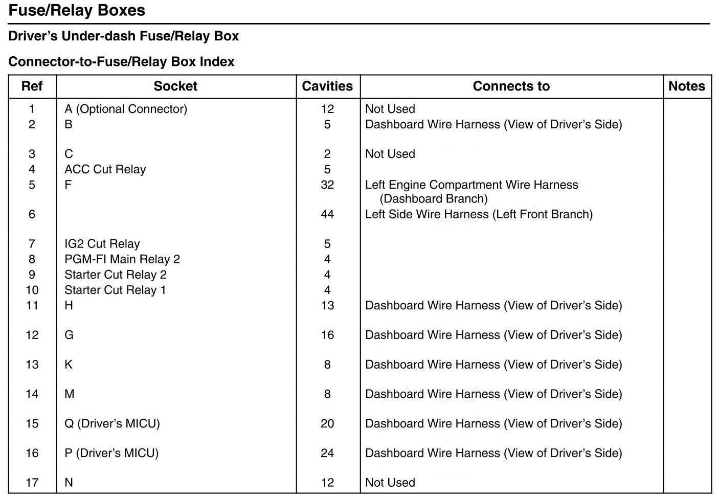Driver's Under-Dash Fuse/Relay Box - Connector-to-Fuse/Relay Box Index