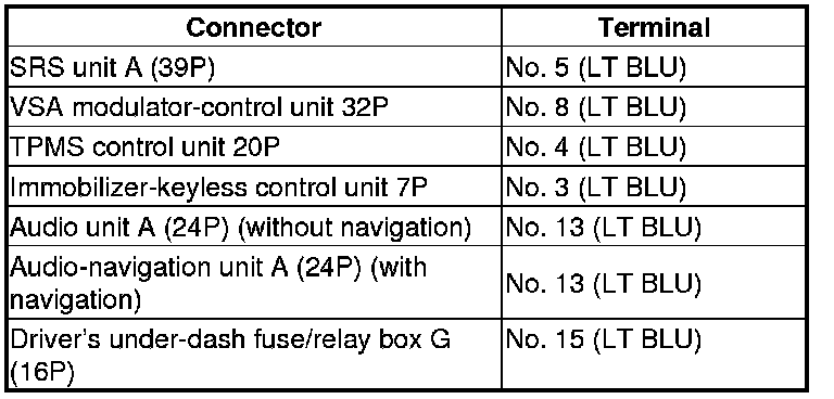 Repair a short in the wire between the DLC (K-line) and the VSA modulator-control unit, the SRS unit, the TPMS control unit, the immobilizer-keyless control unit, the audio unit, the audio-navigation unit, or the driver's under-dash fuse/relay box.