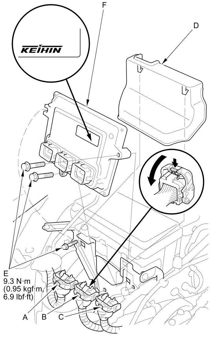 12. Keihin PCM: Loosen or remove the bolts (E), then remove the PCM (F).