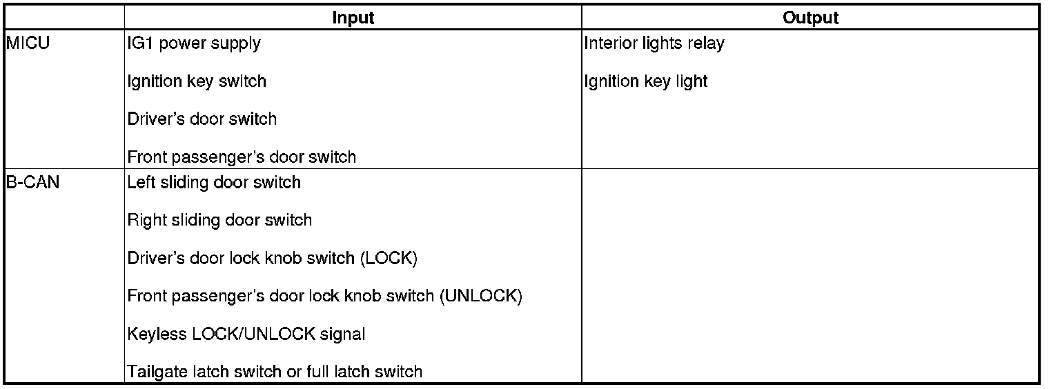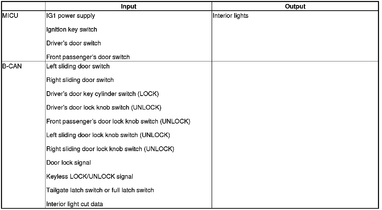 The MICU controls the interior lights and ignition key light ON/OFF based on inputs from each switch and B-CAN data.