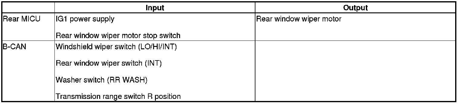 The rear MICU controls the rear window wiper motor and washer motor based on inputs from each switch and B-CAN data.