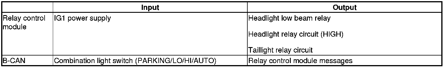The relay control module controls automatic lighting based on inputs from the ignition switch (IG1) and B-CAN data.