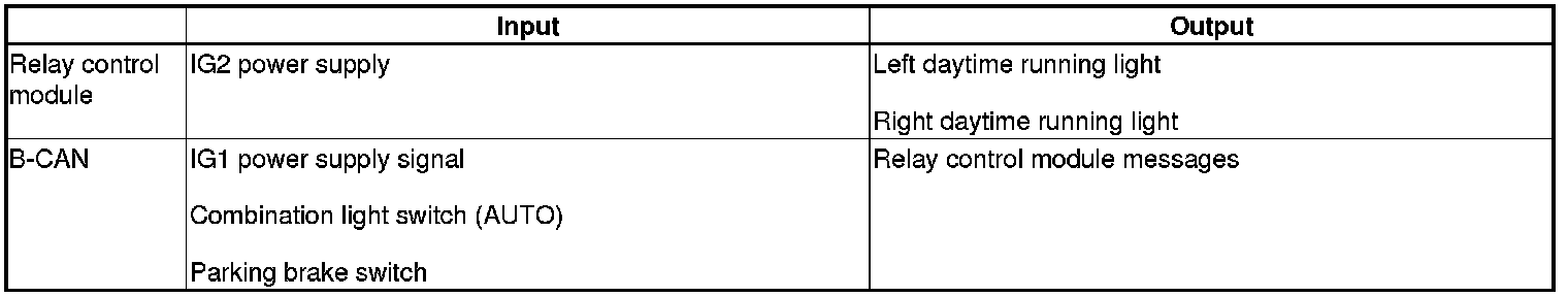 The relay control module controls daytime running lights based on inputs from the ignition switch (IG2) and B-CAN data.