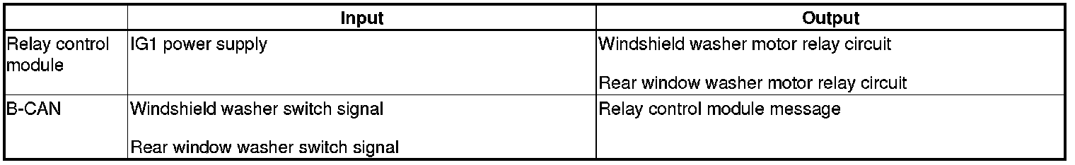 The relay control module controls the rear windshield washer motor and washer motor based on inputs from the ignition switch (IG1) and B-CAN data.
